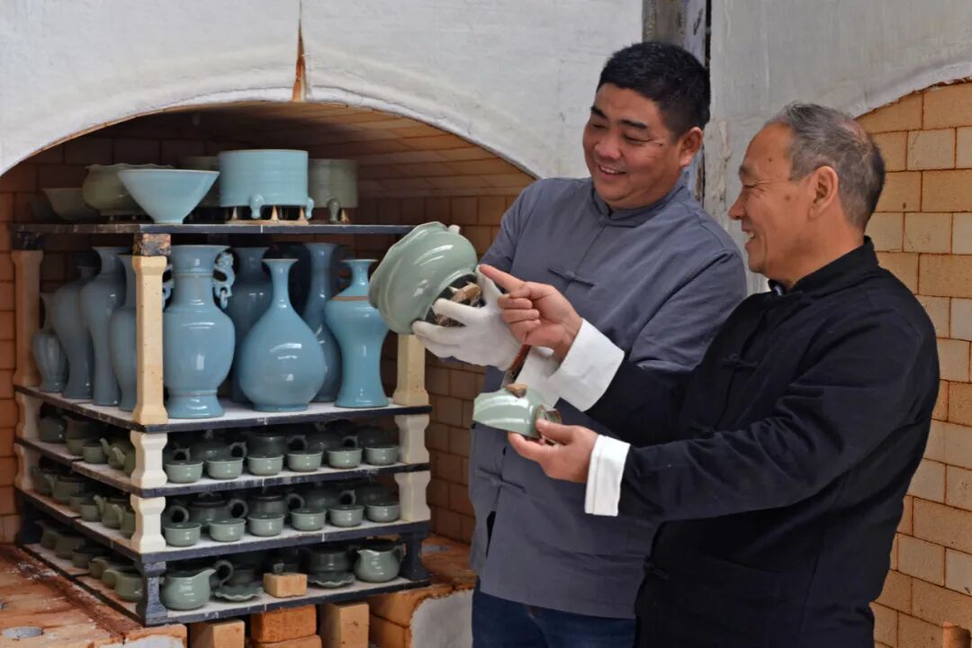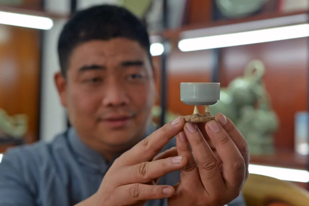 陈松江拿着古瓷片与平社晓刚烧制成的器皿对比