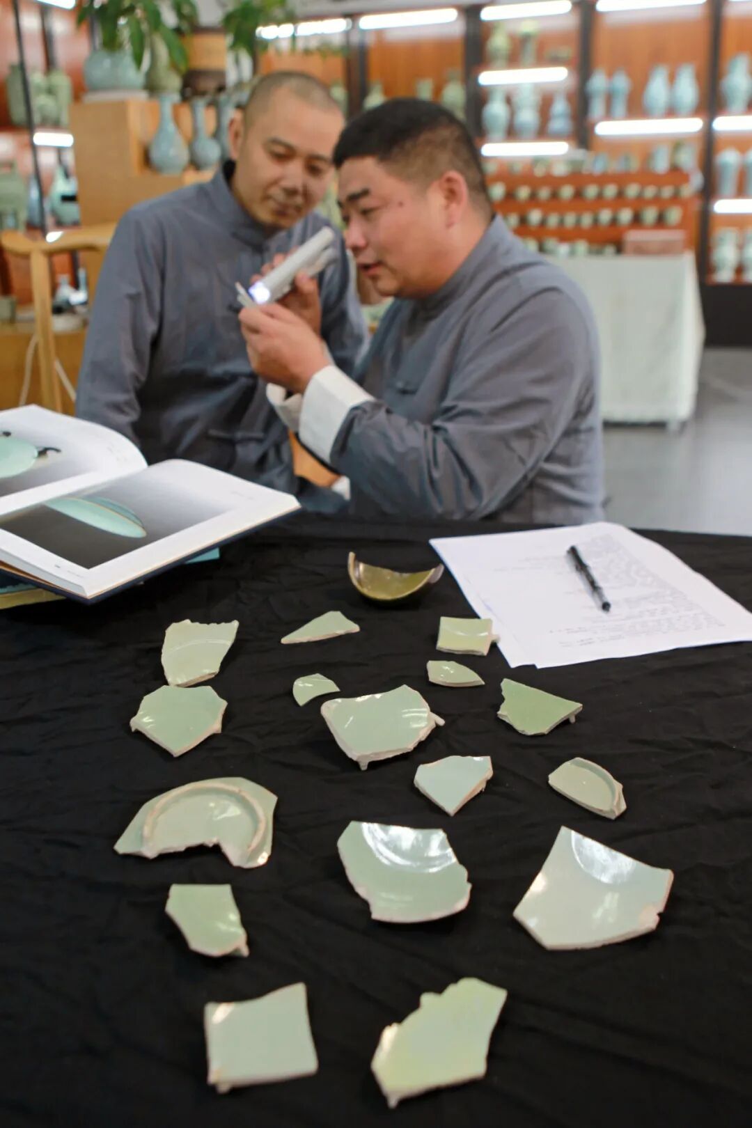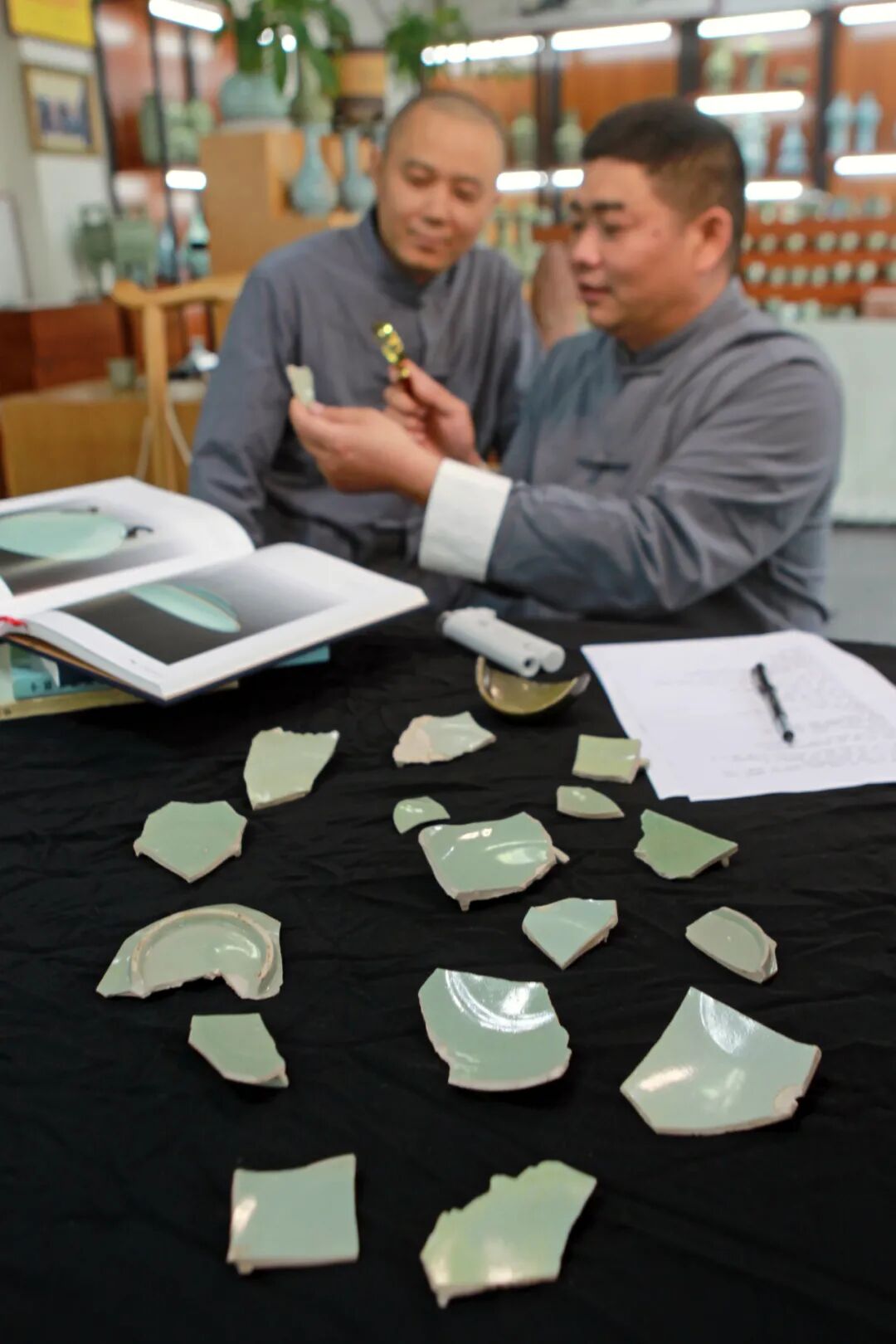 平社晓与师弟张攀峰一起研究古瓷片