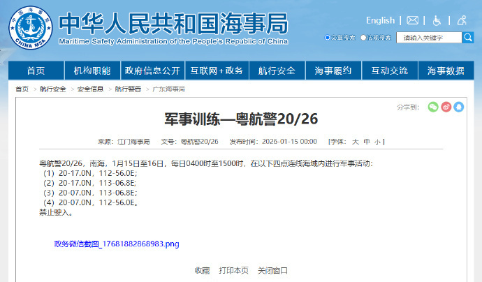 核心提示:据中国海事局网站消息,江门海事局发布航行警告,1月15日至16日,每日4时至15时,南海部分海域进行军事活动,禁止驶入。"